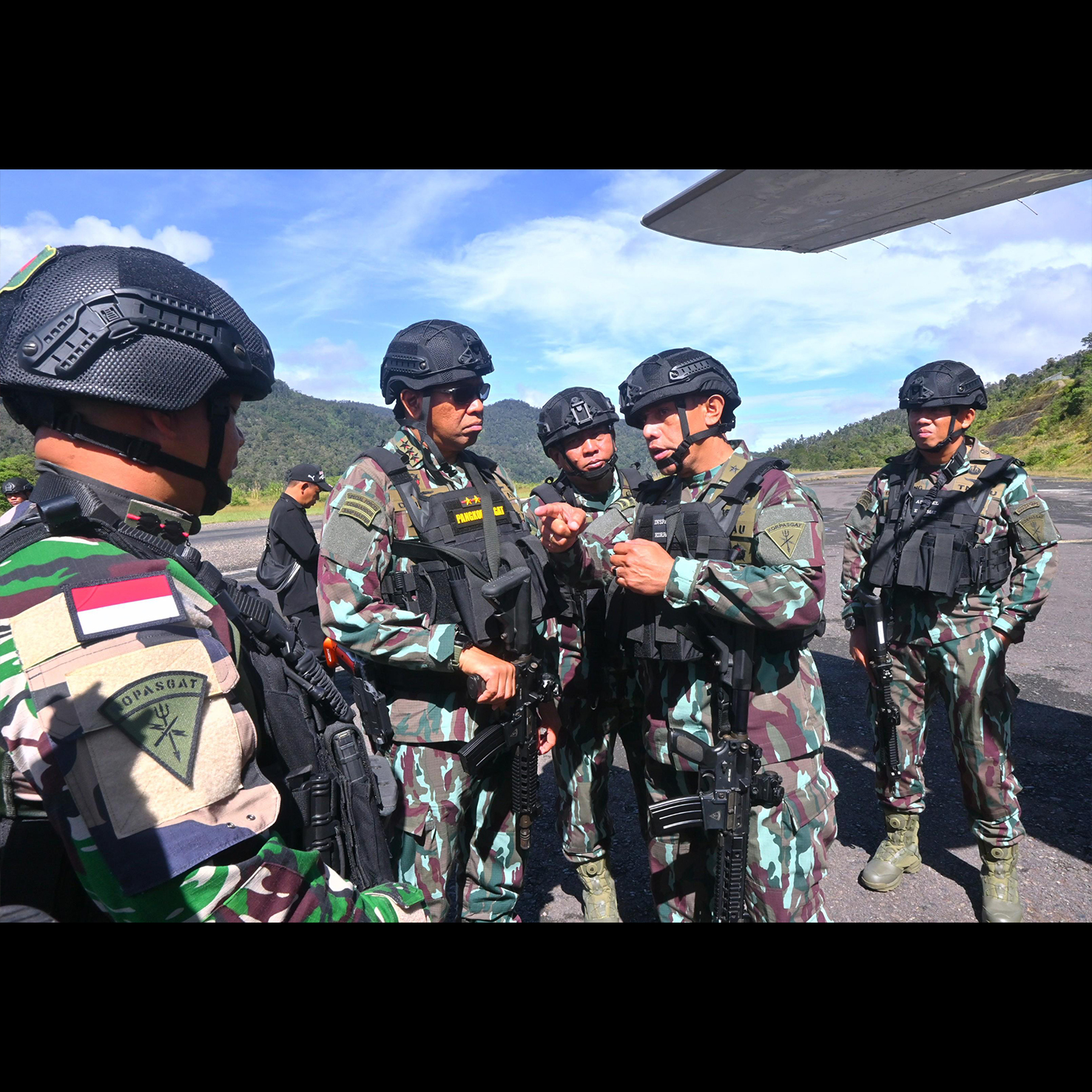 Sugapa, Papua Tengah – Pangkogabwilhan III Letjen TNI Bambang Trisnohadi bersama Pangkorpasgat Marsdya TNI Deny Muis, S.E., M.M. melakukan kunjungan kerja ke Pos Satgas Pamtas Korpasgat di Distrik Sugapa, Kabupaten Intan Jaya, Papua Tengah, Kamis (28/8/2025).