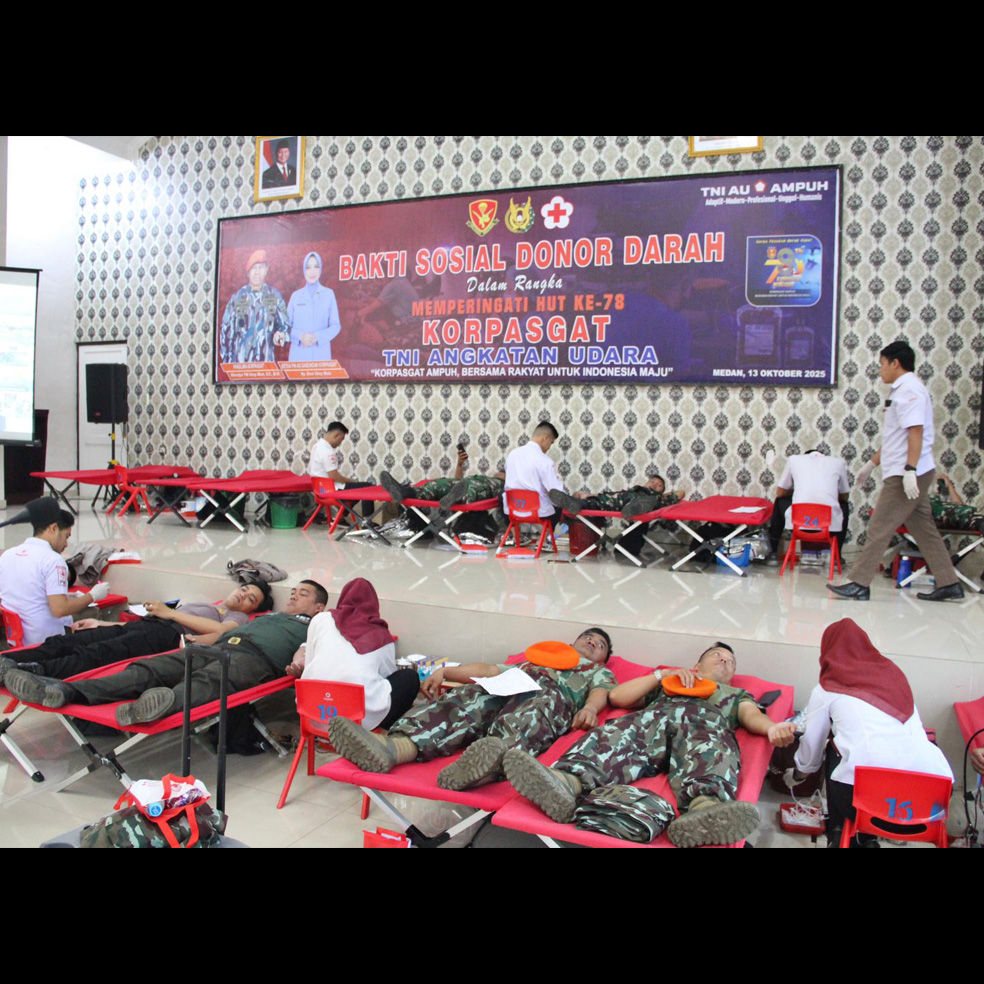 Pen Pancawara – Dalam rangka menyambut Hut Ke-78 Korpasgat,Satuan Jajaran Korpasgat di Medan menggelar kegiatan donor darah yang dilaksanakan di Aula G.Siahaan Batalyon Komando 469 Korpasgat, Medan. Senin (13/10/2025)