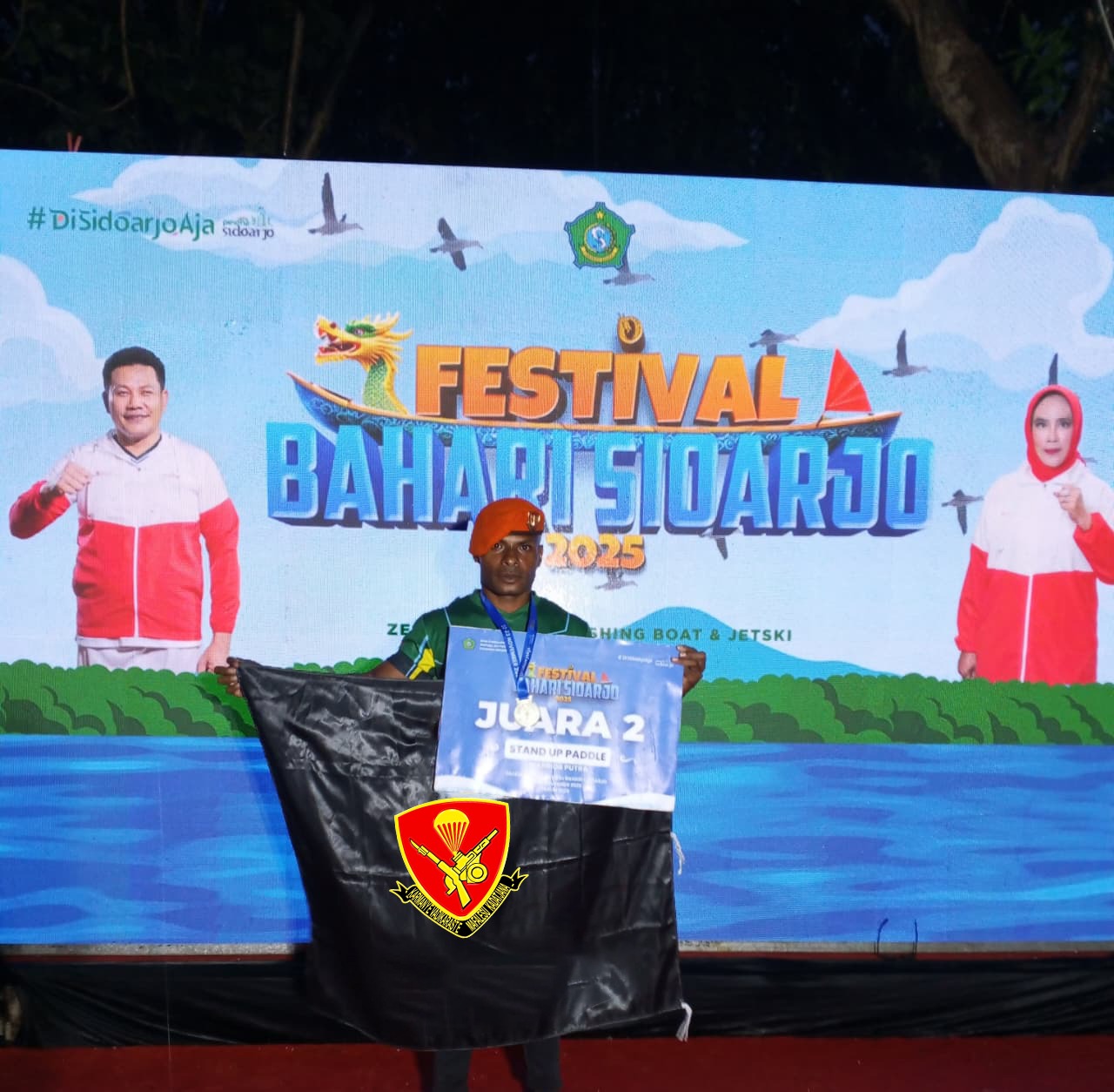 BANDUNG – MAKO KORPASGAT — Atlet dayung Denma Korpasgat, Prajurit Satu (Pratu) Daniel Kabey, kembali menorehkan prestasi membanggakan dengan meraih medali perak pada Kejuaraan Open Festival Bahari nomor Stand Up Paddle Technical 300 meter yang berlangsung di Sidoarjo, Jawa Timur, Jumat (21/11/2025).