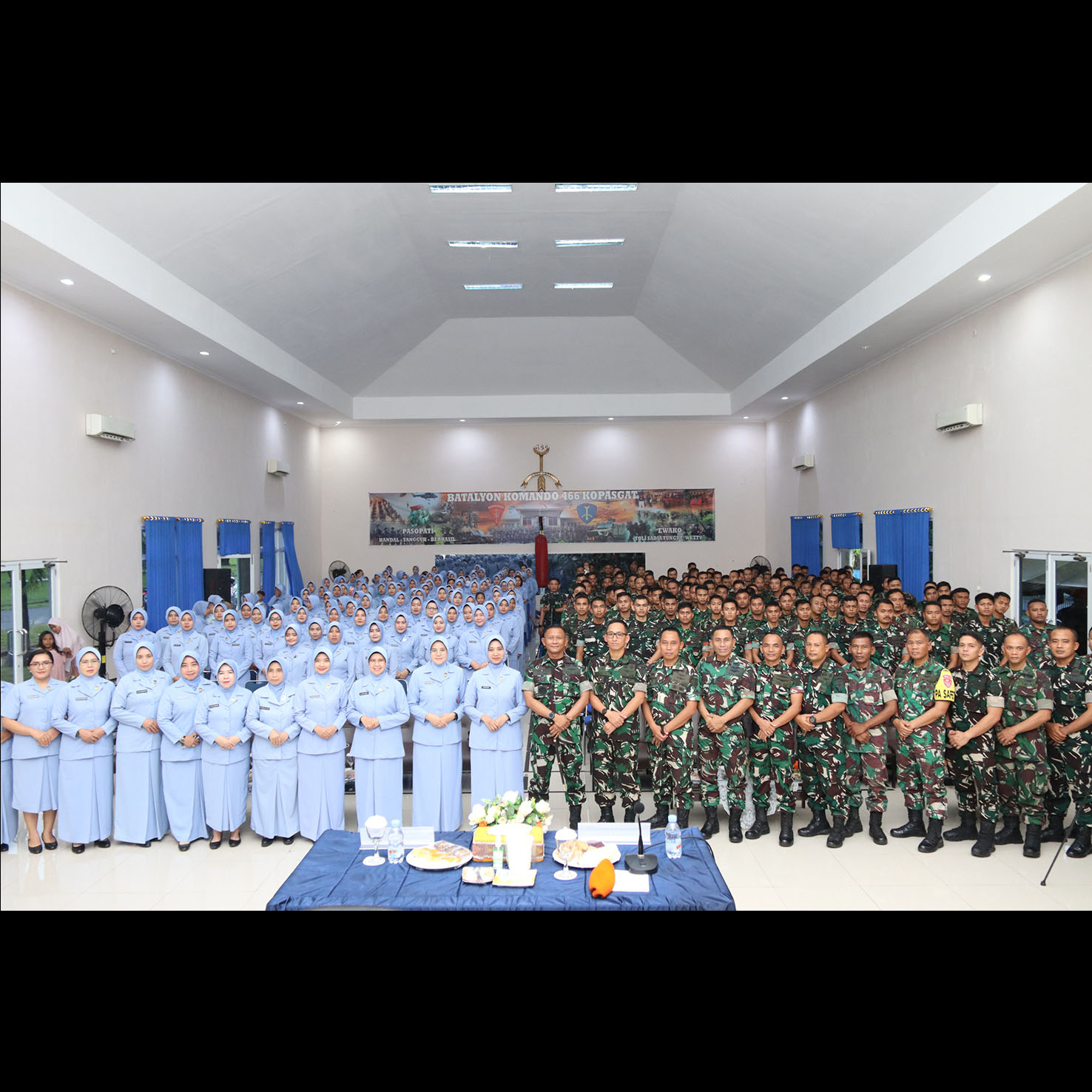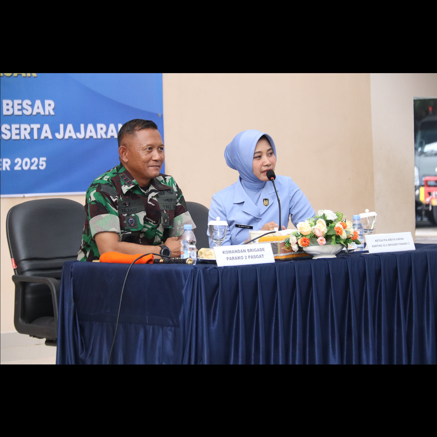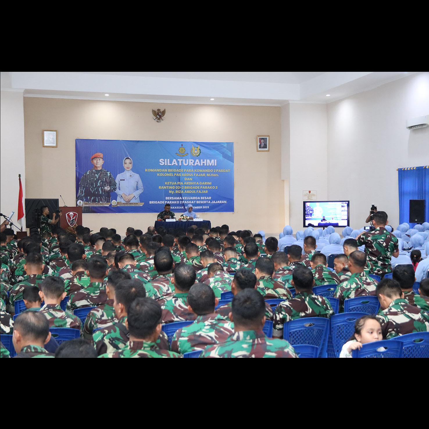 MAKASSAR. BRIGADE PARAKO 2 PASGAT. Komandan Brigade Parako 2 Pasgat Kolonel Pas Abdul Fajar, M.Han., bersama Ketua PIA Ardhya Garini Ranting 02-2 Brigade Parako 2 Ny. Riza Abdul Fajar, melaksanakan acara silaturahmi yang diadakan di Aula Batalyon Komando 466 Korpasgat, Selasa (16/12/2025). Acara ini dihadiri secara langsung oleh Para Komandan Satuan, Perwira, Bintara, Tamtama beserta keluarga dari satuan yang berada di wilayah Makassar, sementara jajaran yang bertugas di lokasi lain mengikuti melalui platform Virtual Zoom. Kegiatan dibuka dengan pembacaan doa bersama, diikuti sambutan dari Komandan Brigade yang menyampaikan apresiasi atas kontribusi seluruh personel dan keluarga dalam mendukung tugas operasional serta pembangunan satuan.