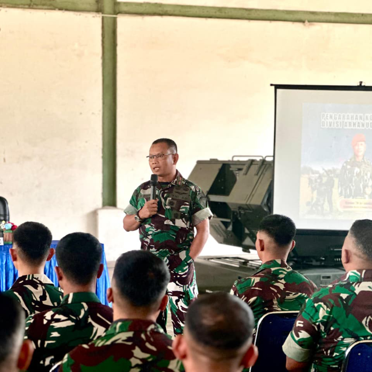 Komandan Divisi Arhanud Pasgat, Marsekal Pertama TNI Ari Ismanto, memberikan pengarahan kepada seluruh prajurit Batalyon Arhanud 12 Pasgat di Shelter Gun Batalyon Arhanud 12 Pasgat, Jakarta, Senin (26/1/2026). Pengarahan ini menekankan upaya pembinaan kemampuan dan kekuatan guna mewujudkan satuan Arhanud Pasgat yang militan, modern, profesional, dan handal.
