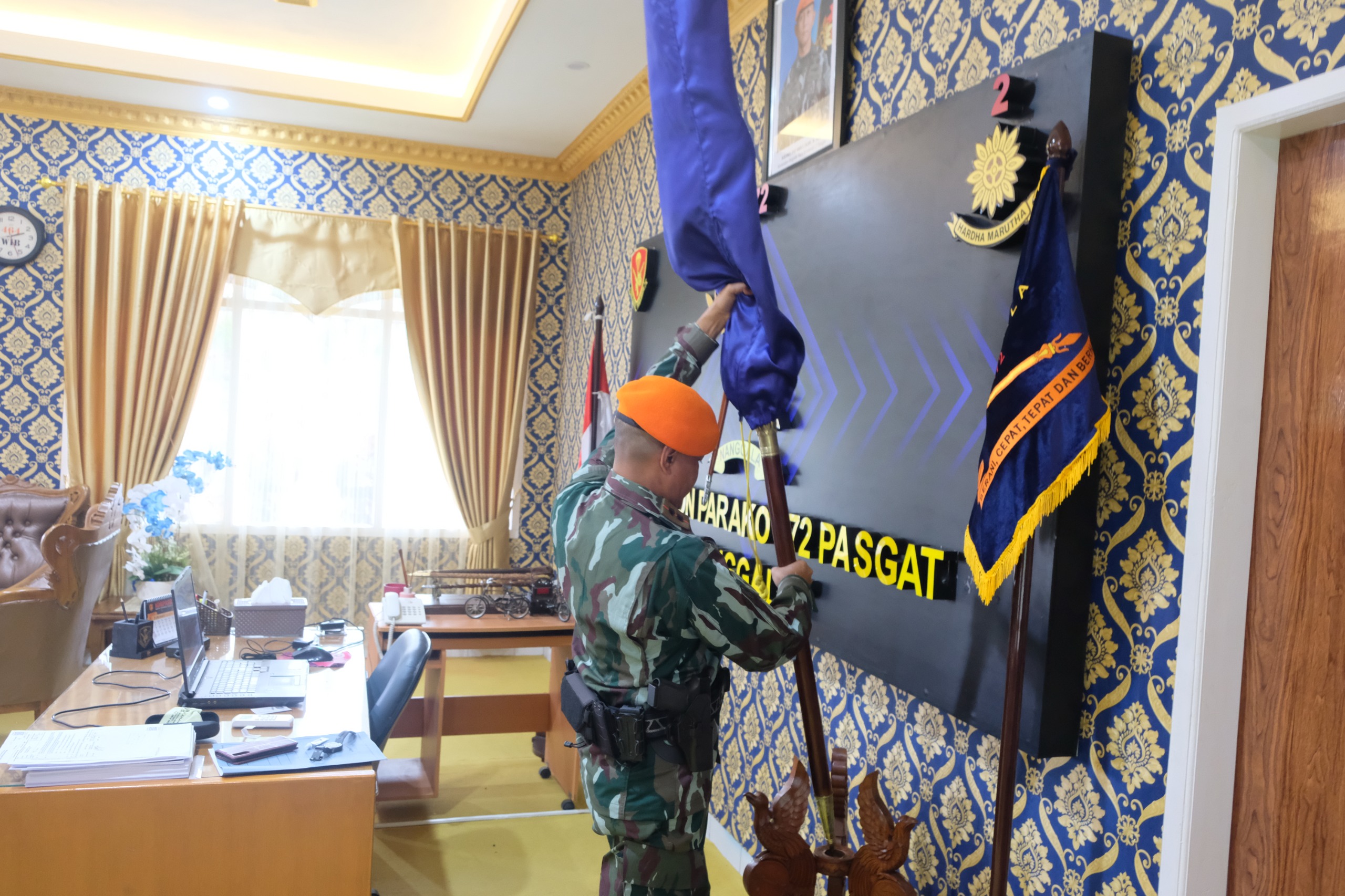 Prosesi yang berlangsung khidmat ini menandai perubahan identitas resmi dari Batalyon Komando 464 Korpasgat “Nanggala” menjadi Batalyon Para Komando 472 Pasgat “Nanggala” bagian dari transformasi organisasi dan penguatan jati diri satuan.