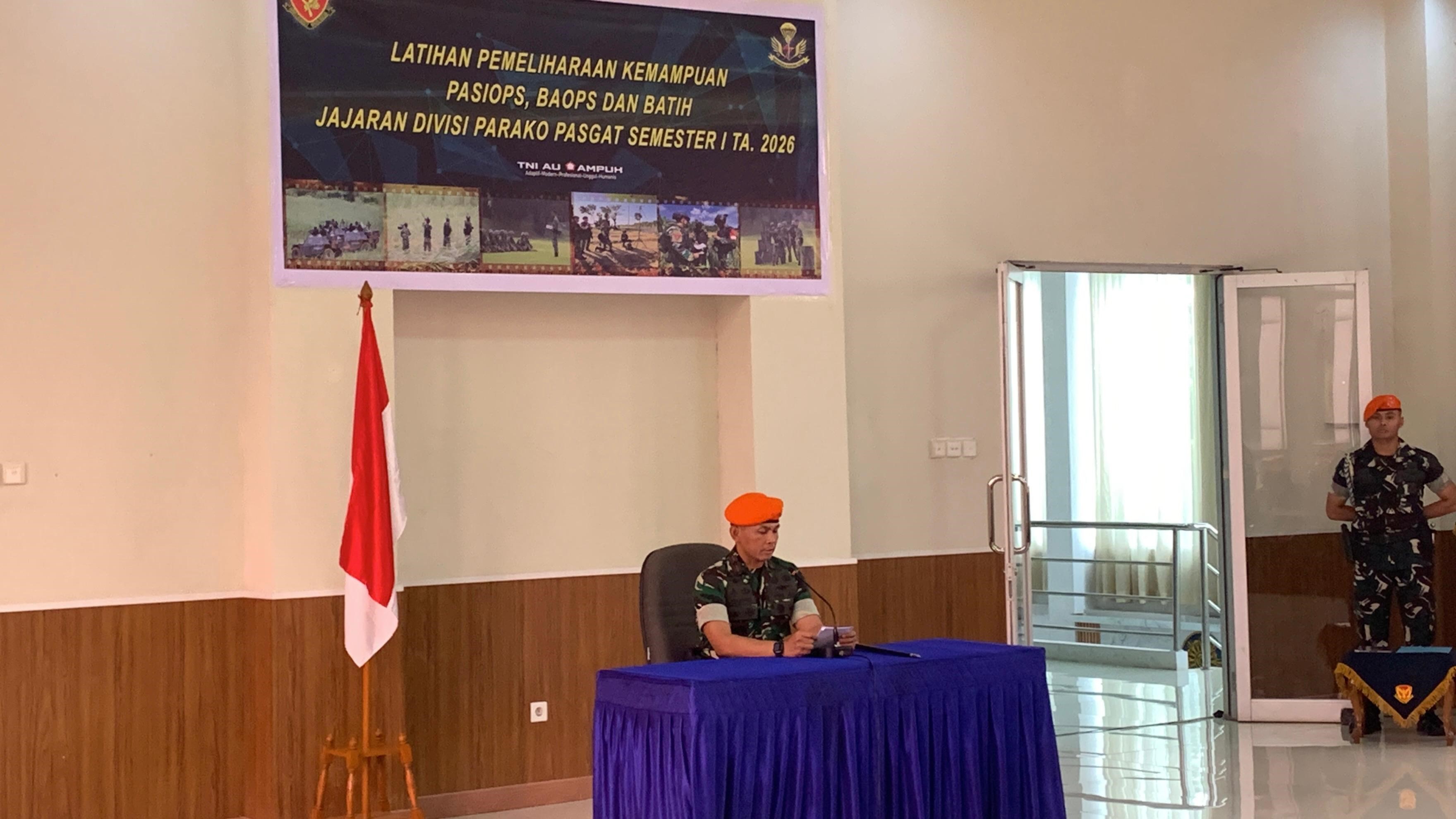 Jakarta – Divisi Parako Pasgat. Komandan Divisi Parako Pasgat Marsma TNI Ahmad Sunawar, S.Qodri, M.Han. pimpin upacara pembukaan Latihan Pemeliharaan Kemampuan Perwira Seksi Operasi (Pasiops), Bintara Operasi (Baops) dan Bintara Pelatih (Batih) di jajaran Divisi Parako Pasgat yang dilaksanakan di ruang Oyu Yon Parako 461 Pasgat, Senin (23/02/2026).