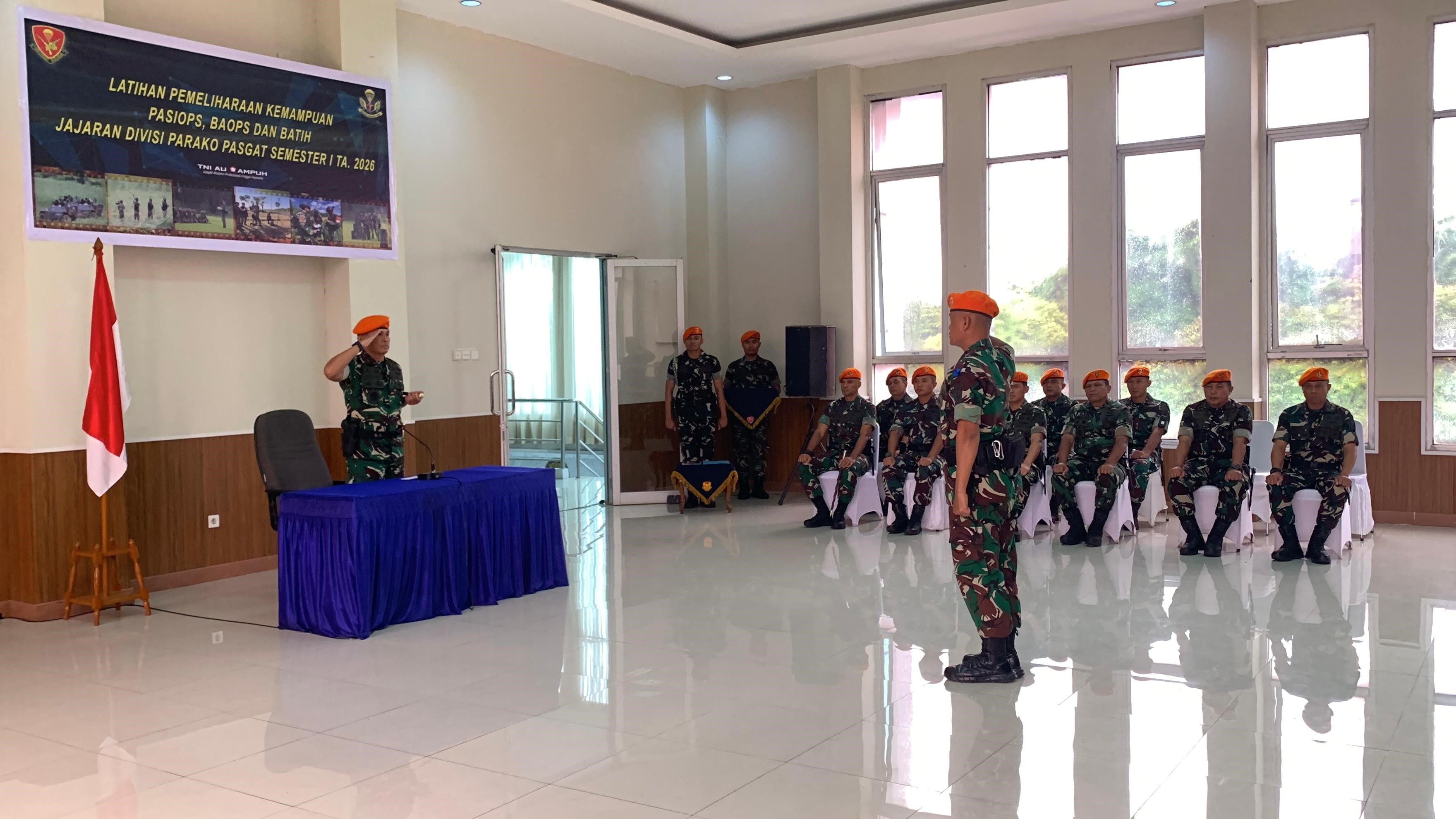 Jakarta – Divisi Parako Pasgat. Komandan Divisi Parako Pasgat Marsma TNI Ahmad Sunawar, S.Qodri, M.Han. pimpin upacara pembukaan Latihan Pemeliharaan Kemampuan Perwira Seksi Operasi (Pasiops), Bintara Operasi (Baops) dan Bintara Pelatih (Batih) di jajaran Divisi Parako Pasgat yang dilaksanakan di ruang Oyu Yon Parako 461 Pasgat, Senin (23/02/2026).