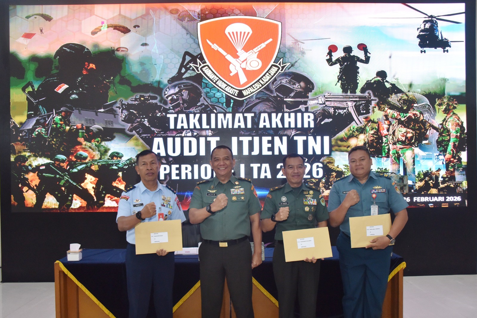 Bandung — Mako Korpasgat. Taklimat akhir dilaksanskan sebagai penutup rangkaian kegiatan evaluasi Tim Audit Itjen TNI Tahun Anggaran 2026 di Satuan TNI se-Wilayah Jawa Barat. Kegiatan ini dipimpin Wairjen TNI, Mayjen TNI Dr. Alvis Anwar, S.A.P., M.Tr.(Han)., CGCAE., CFRA., dan diterima oleh Kas Korpasgat Marsda TNI Anis Nurwahyudi di Gedung Wargaming Mako Korpasgat, Kamis (26/02/2026).