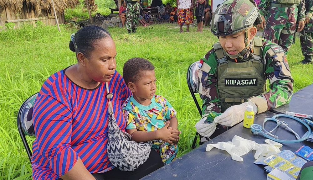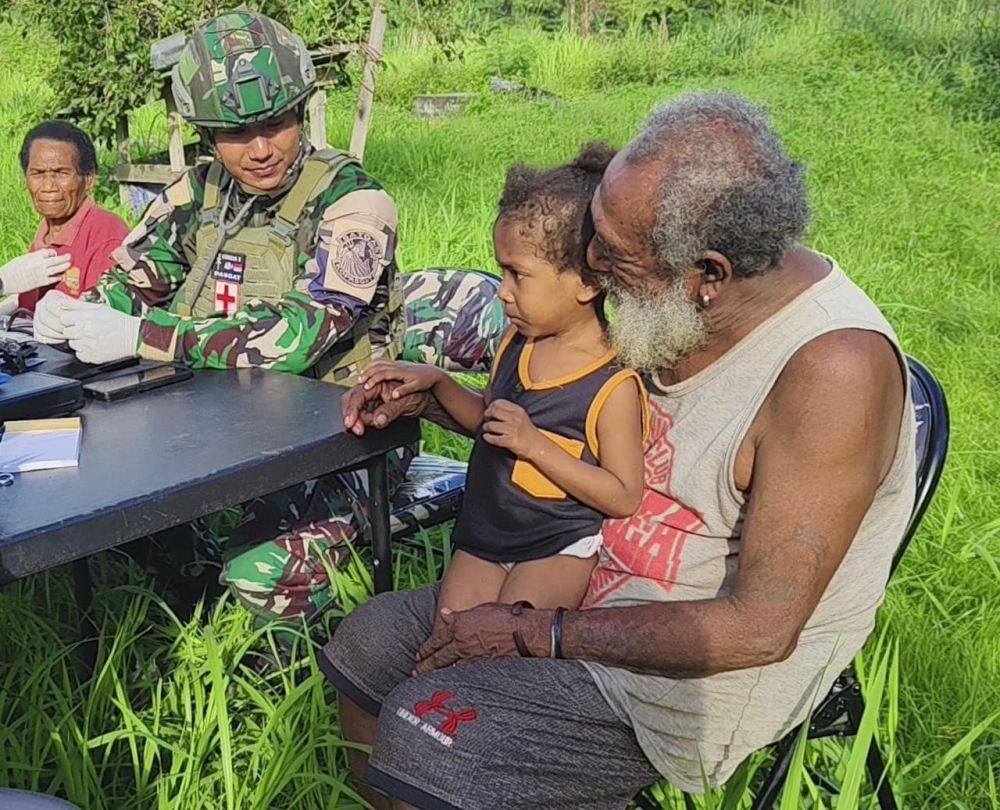 Tidak hanya menyasar orang dewasa, pelayanan juga diberikan kepada anak-anak. Prajurit medis tampak berinteraksi secara ramah dengan balita guna menghilangkan rasa takut serta memantau kondisi kesehatan dan tumbuh kembang mereka.